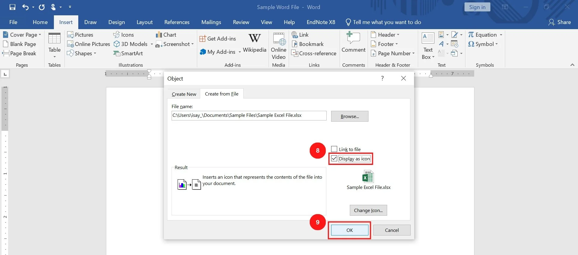 Step 8: Back in the Object dialog box, select Display as icon to insert an icon that represents the embedded file. Once embedded, you can then click this icon to open and edit the file. Note: Select Link to file so that changes in the source document will automatically be reflected in the embedded file.