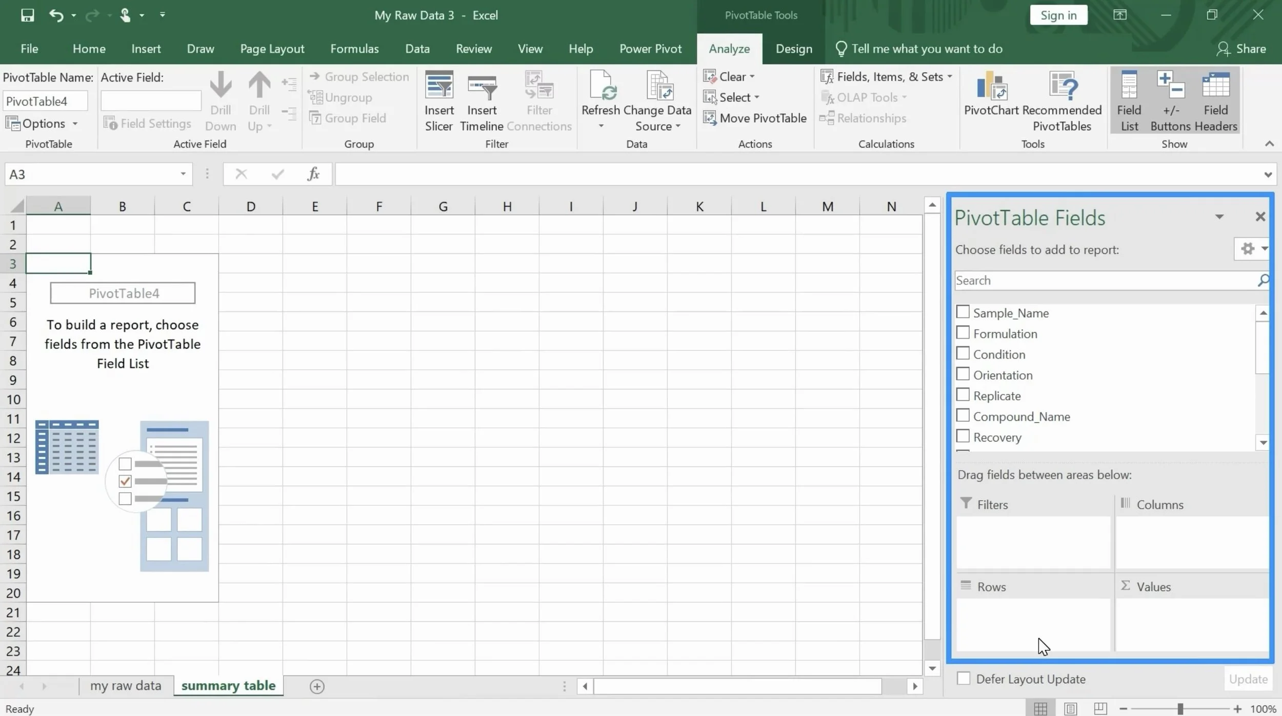 Step 2. On the right side of the sheet, we can see the pivot table fields pane. This is where we can configure the fields that we will use to build our table. We could drag and drop the following fields: