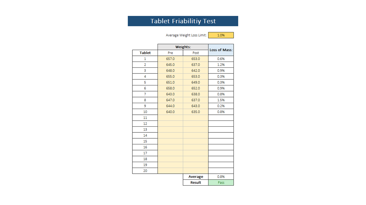 To test for friability, pre-weighed tablets must be placed in a tablet friability apparatus where the tablets are tumbled 100 times. After rotating, the tablets are weighed and the weight loss is calculated. If the results are difficult to interpret, it is recommended to repeat the test twice and get the mean of the three tests. A weight loss of 1.0% is considered acceptable for most products. If the tablets crack or break during the process, the samples fail the friability test.